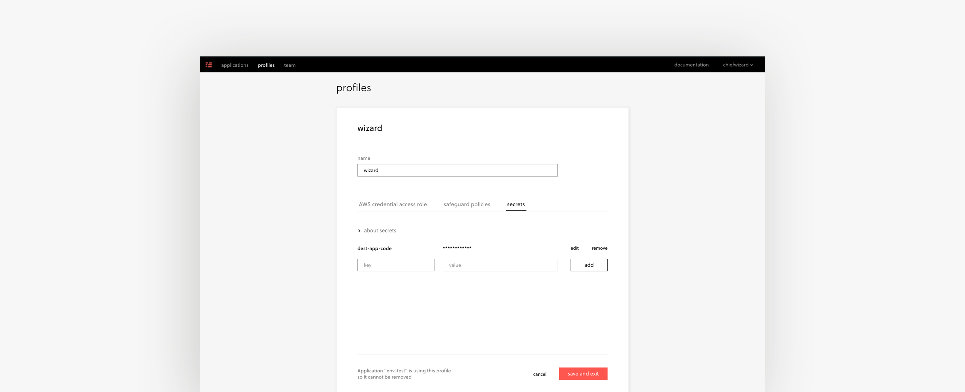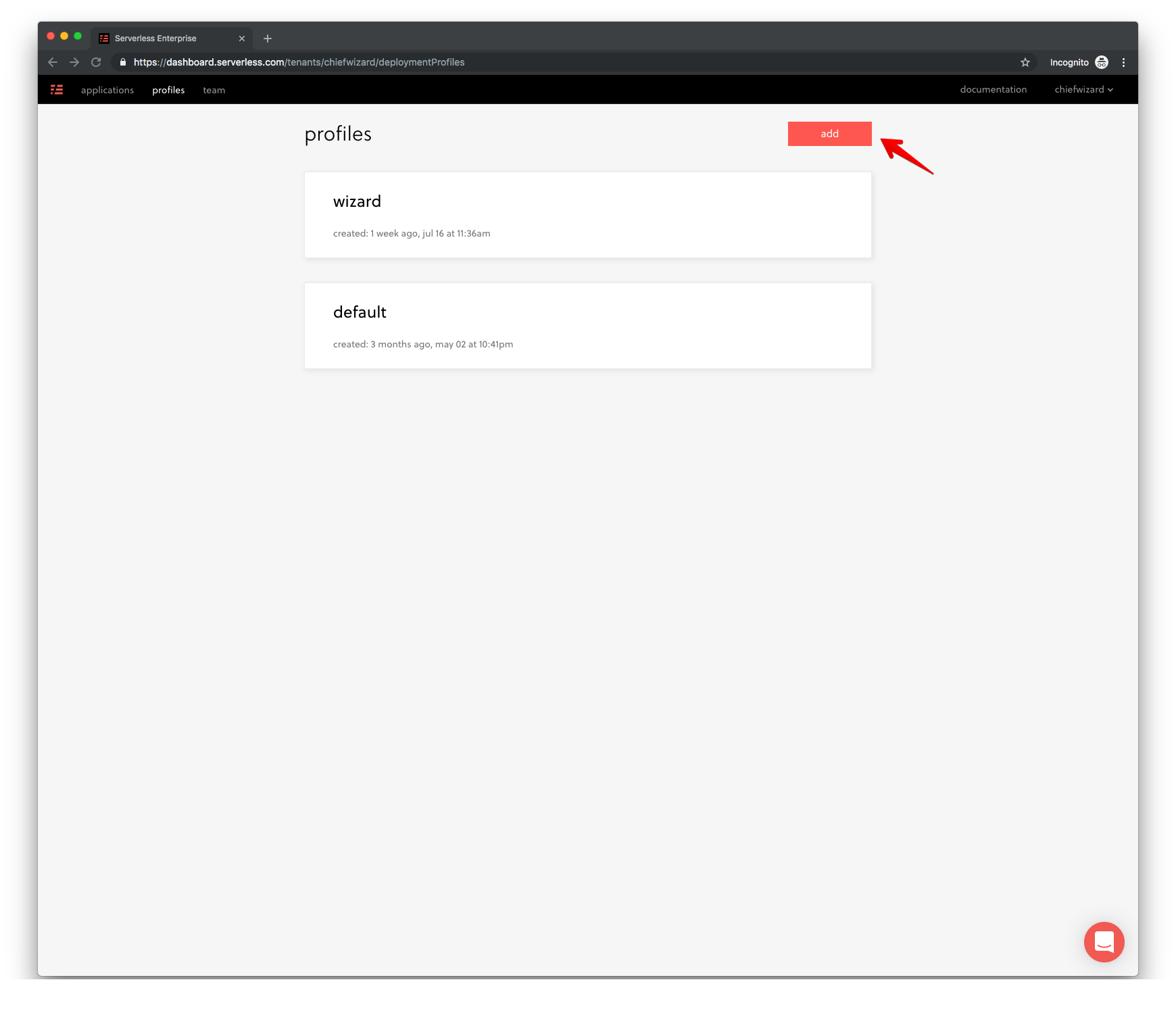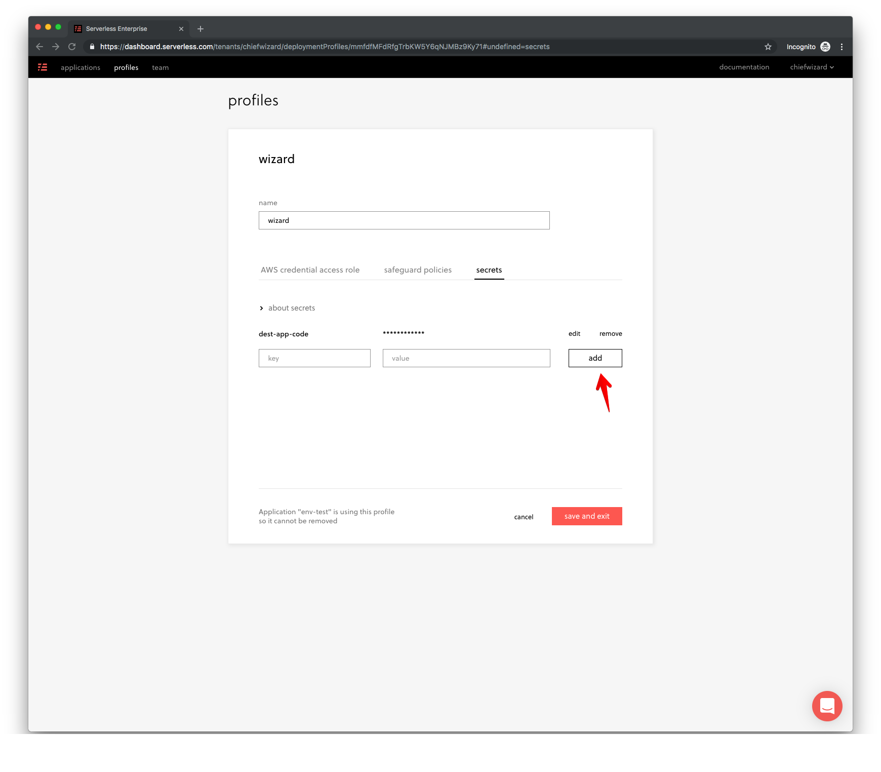 After logging into the Serverless Dashboard, we add the secret we want to store under the Secrets tab in the Profile section. (You’ll need to create a new profile if you don’t have one yet.)