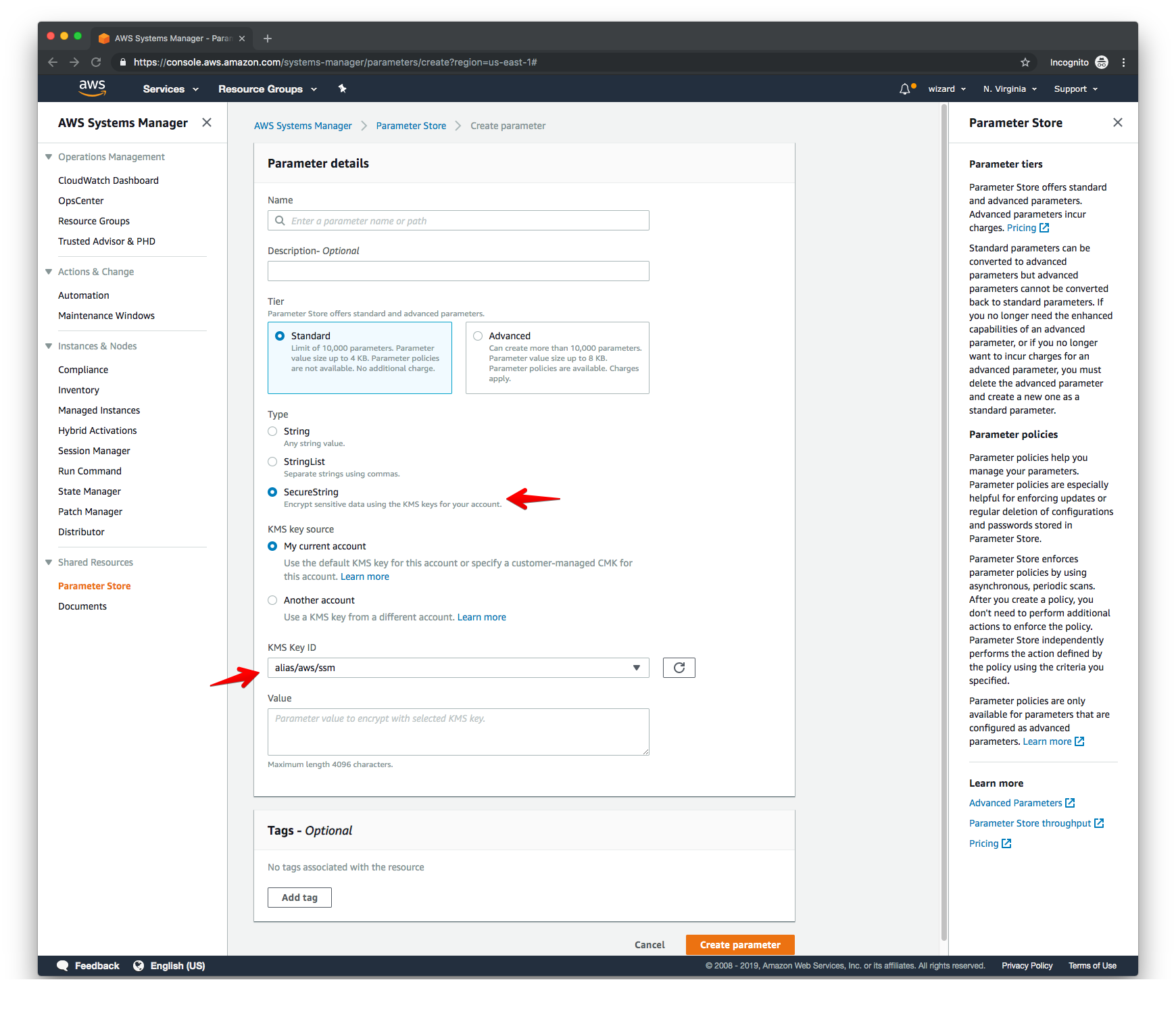 To add a new secret in the AWS Systems Manager user interface, we specify the Secure String type and use the default KMS key to encrypt it.