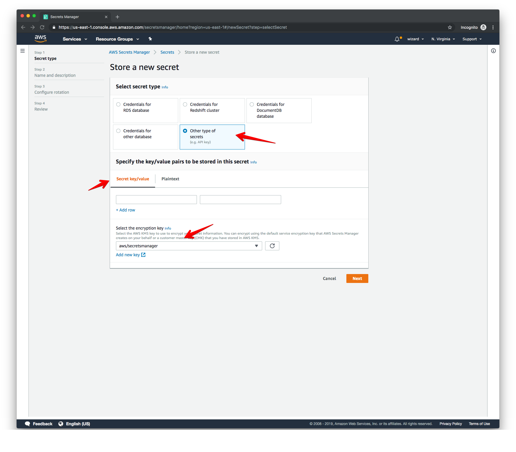 To add a new secret in AWS Secrets Manager we click the "Store New Secret" button in the Secrets Manager UI and set the secret type to "Other". Make sure you’re adding an encrypted secret rather than a plain-text field.