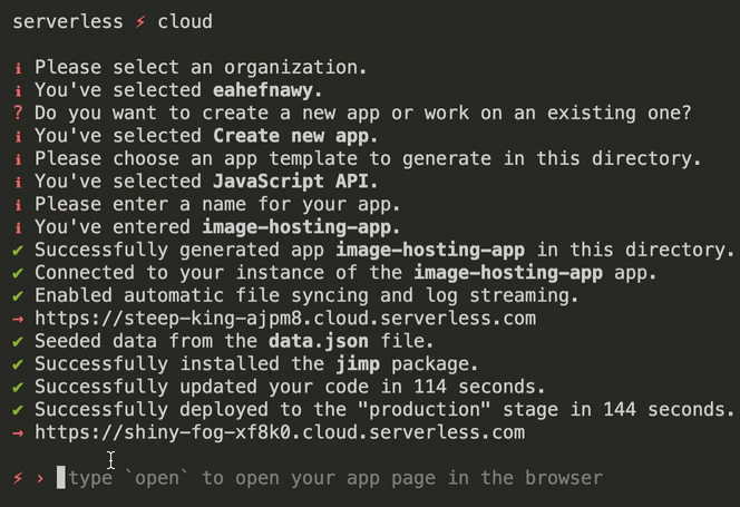 Create a new empty directory called image-hosting-app, then open this new empty directory in your favorite IDE. This will be the directory containing your app files. Then, using your IDE built-in terminal, initialize a new Serverless Cloud project by entering the following command:
