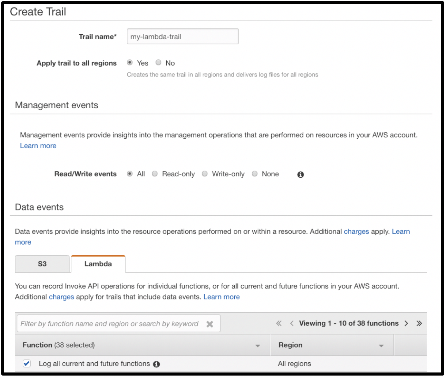 Note that not all AWS Lambda actions and data are available. At the time of writing, the following AWS Lambda actions are logged in CloudTrail: