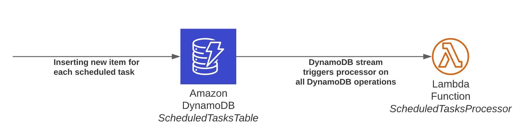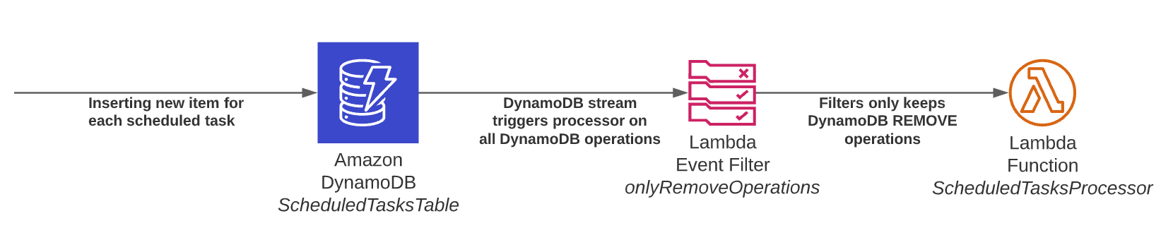 When the task scheduled time is reached, DynamoDB deletes the corresponding item. A REMOVE event is then published in the table stream, event that can be processed by Lambda to execute the actions corresponding to the task.
