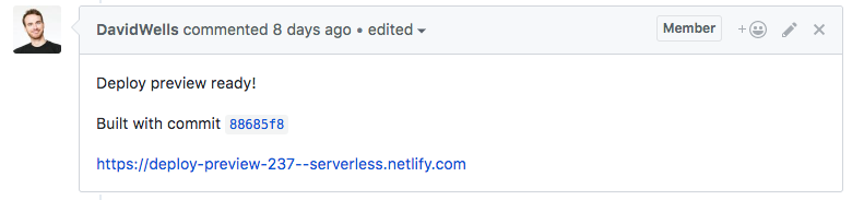 On the Serverless.com site, when we create a new branch, Netlify pings us with a GitHub comment on that branch to generate a build preview URL for us: