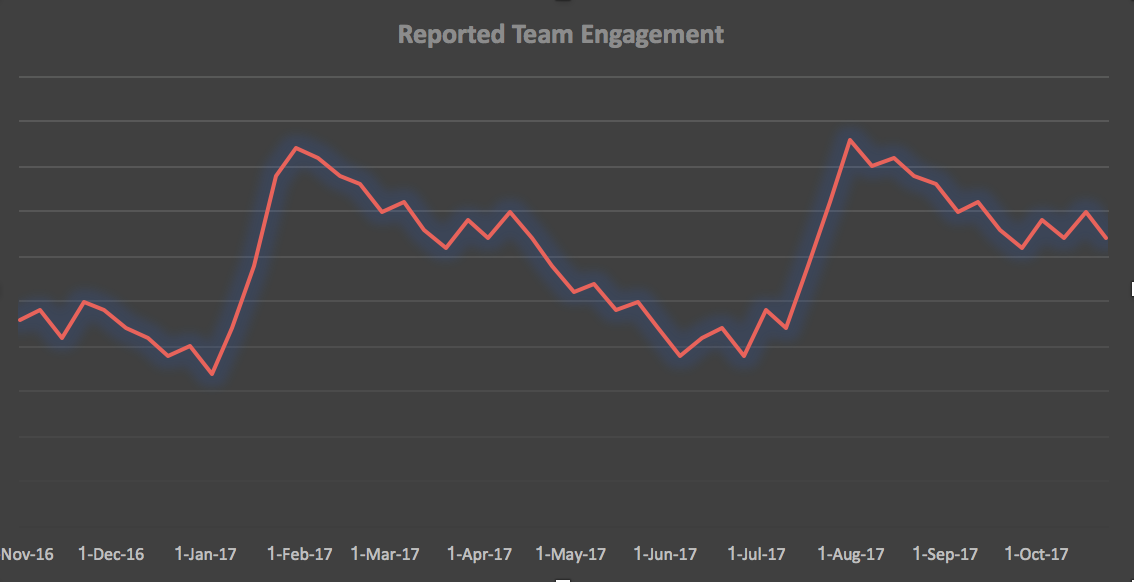 Our team trend includes a big spike in satisfaction right after a team retreat, followed by a slow taper-off: