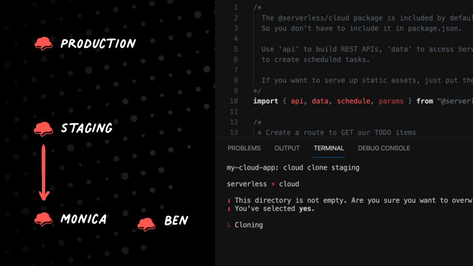 Serverless Cloud helps you develop on the cloud—fast. Install it with NPM, run the `cloud` command to create an app, and answer a few simple prompts. In seconds you're up and running with a live, auto-scaling, serverless front-end and backend.