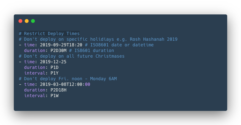 Imagine you're an ecommerce team going into your annual Black Friday rush. You're confident in the state of your code as it is but you'd like to limit even the hint of a possibility that a new bug is introduced during the busy season. One common way to do this is to lock down your deployments during that period. Something similar happens at organizations that really don't want to get on-call notifications on weekends so they may lock down deployments between Friday and Monday morning.