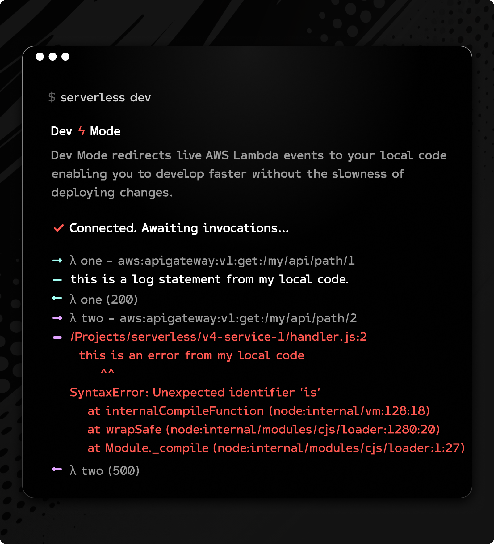 Dev Mode works for all AWS Lambda functions in your service. Each invocation gets a unique color for easy log identification, and important event details like HTTP paths and methods are automatically logged.