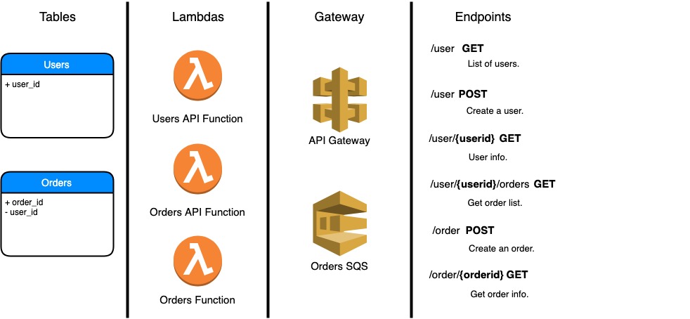 an API Gateway The API has 6 endpoints. One to create a user, one to get a user information, one to get a list of users, one to get a list of orders for a user, one to get order information for that user, and one to create an order.