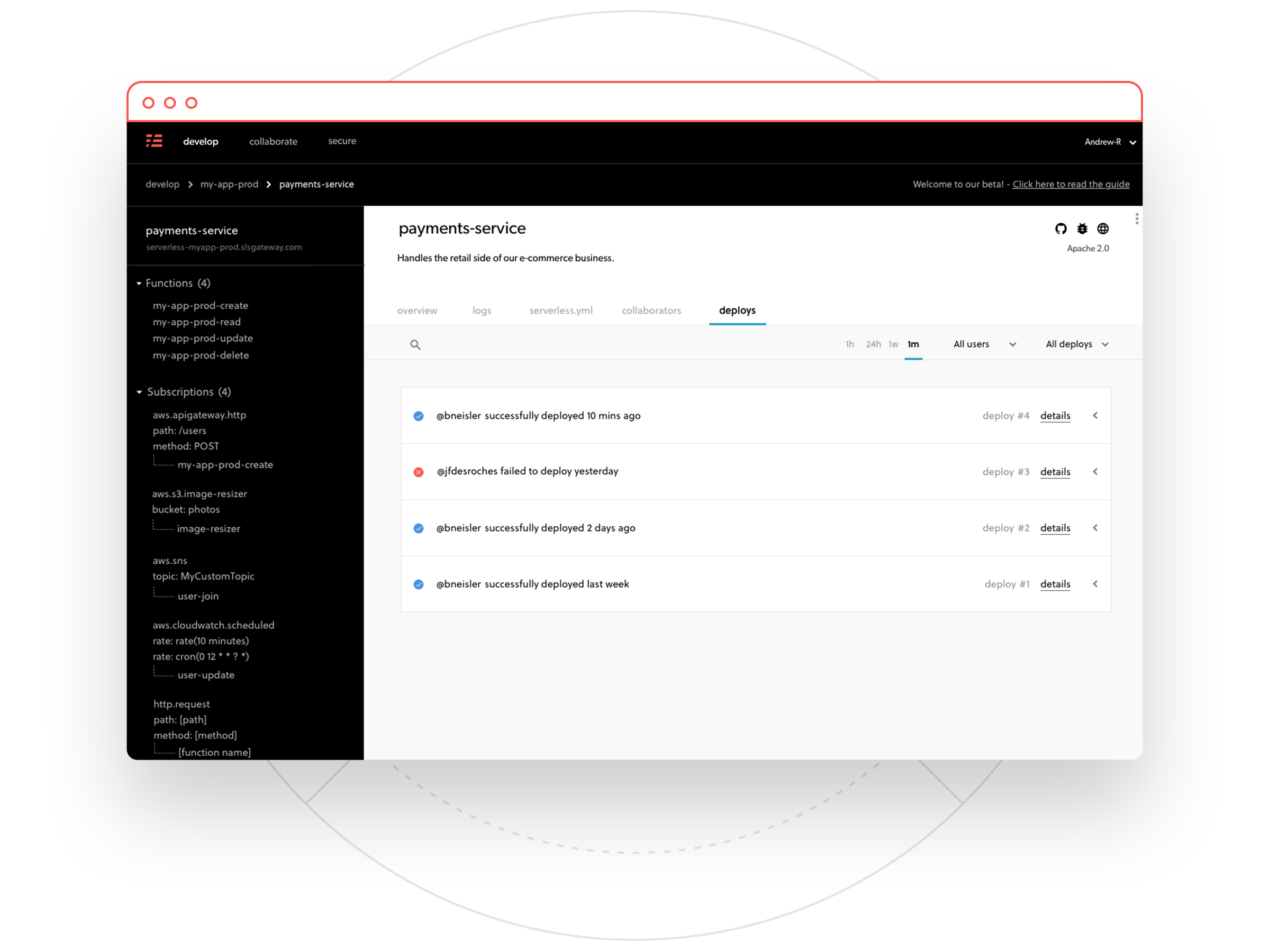 To date, working on a serverless service has put developers in a silo. There was no easy way to work on a service with others, check who deployed last and when, or to see exactly what changed.