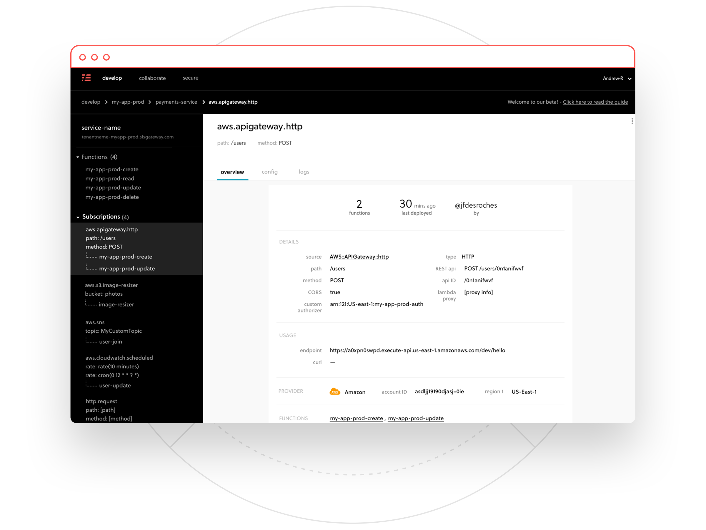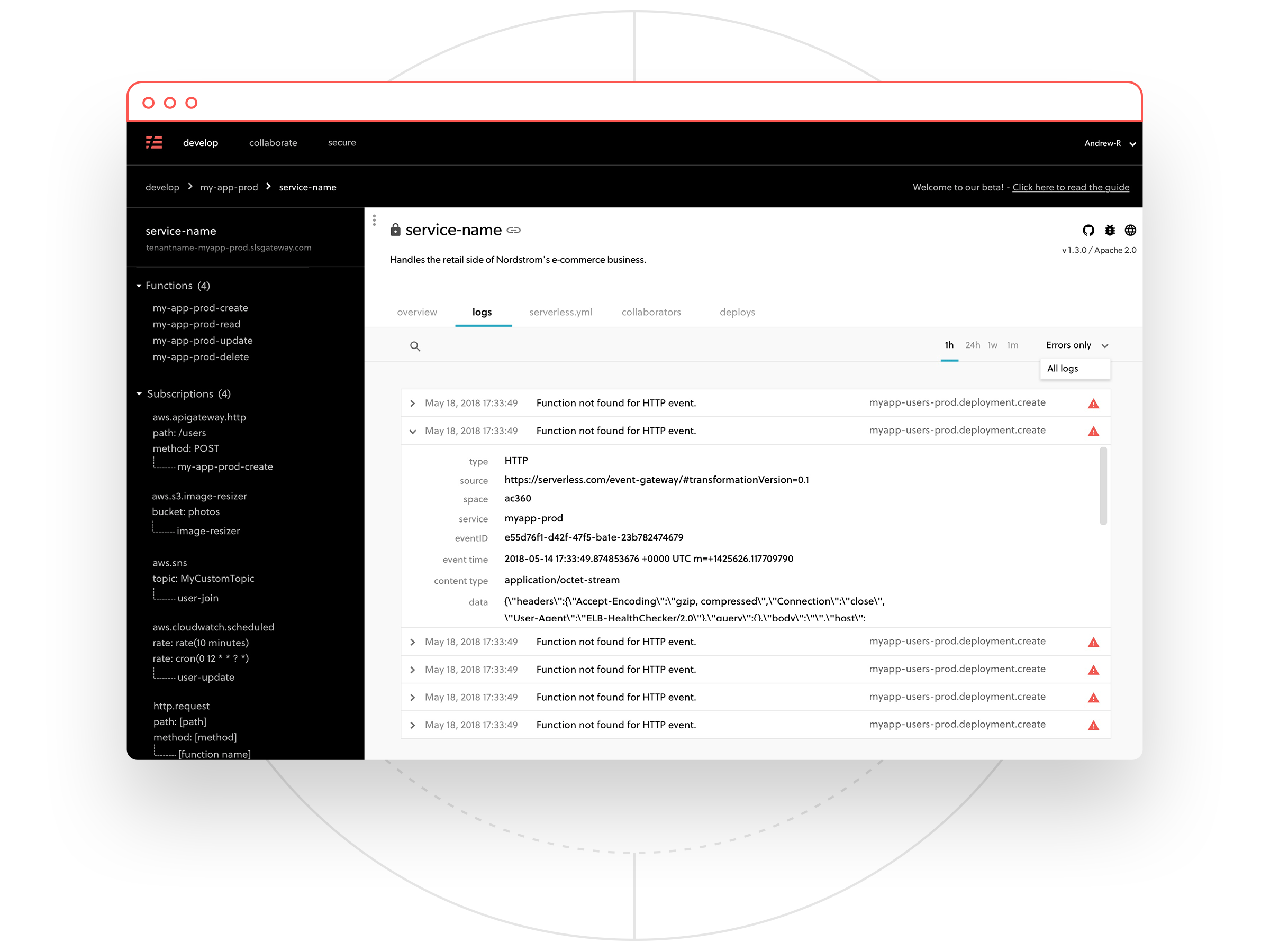 Instead of trying to hold all the pieces of your serverless application in your head, you can see them visually in the Dashboard. Teammates and executives can have oversight over all of your serverless applications.