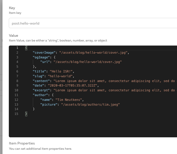You'll notice that I specified "revalidate: 10" in `getStaticProps()`. This tells Next.js that the page is stale after 10 seconds. In the real world I'd definitely suggest a longer expiry time, this is just a demo! Let's change the title of the "hello-world" post to "Hello ISR!", by editing the data item in the Cloud dashboard:
